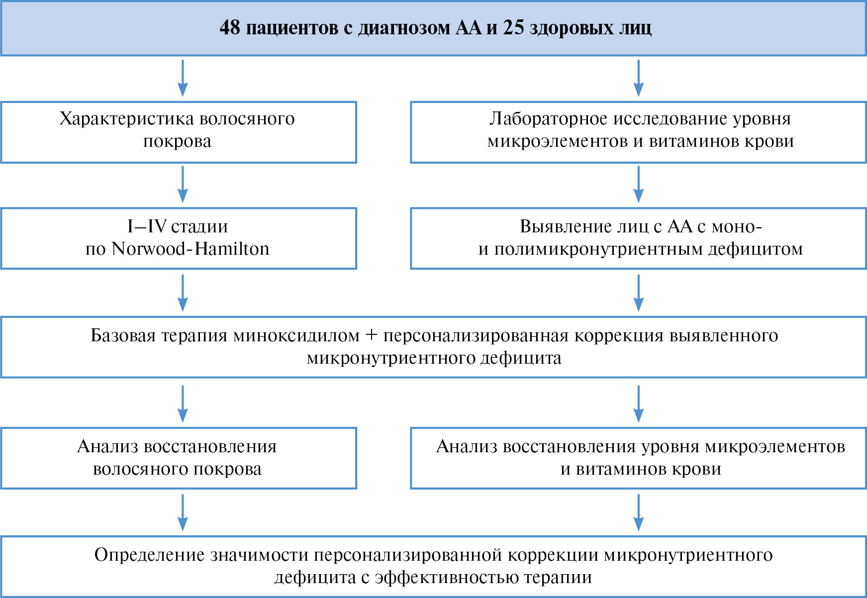Осуществлено проспективное клиническое исследование эффективности использования фармакологических форм микроэлементов и витаминов при проведении консервативной терапии пациентов с начальными стадиями АА (рис. 1). Первичная диагностика относительного дефицита микронутриентов выполнена методом «случай–контроль» путем сравнения лабораторных показателей пациентов с клинической картиной АА и группы здоровых добровольцев (группы сравнения). На основе полученных данных из пациентов с АА формировались подгруппы с нормальным содержанием определенного микронутриента и с его относительной недостаточностью, при выявлении которой проводилась персонализированная фармакологическая коррекция. В связи с тем что для большинства микронутриентов не установлены строгие границы нормы, а их относительная недостаточность оценивается путем сопоставления с группой сравнения, представленной здоровыми людьми того же пола и возраста, проживающими на той же территории, установление недостаточности микронутриентов и доли пациентов с недостаточностью проводилось с путем сравнения с внутрилабораторной нормой. При этом пороговое значение относительной недостаточности не превышало значения 25 перцентиля для этого показателя в группе сравнения. В качестве косвенного результата терапии использовалась нормализация содержания микроэлемента или витамина в плазме крови. Прямым критерием эффективности являлось изменение (улучшение) инструментально регистрируемых параметров волосяного покрова. В завершение исследования оценивали соответствие между изменениями лабораторных показателей и показателей трихограммы до и после проведения консервативной терапии.