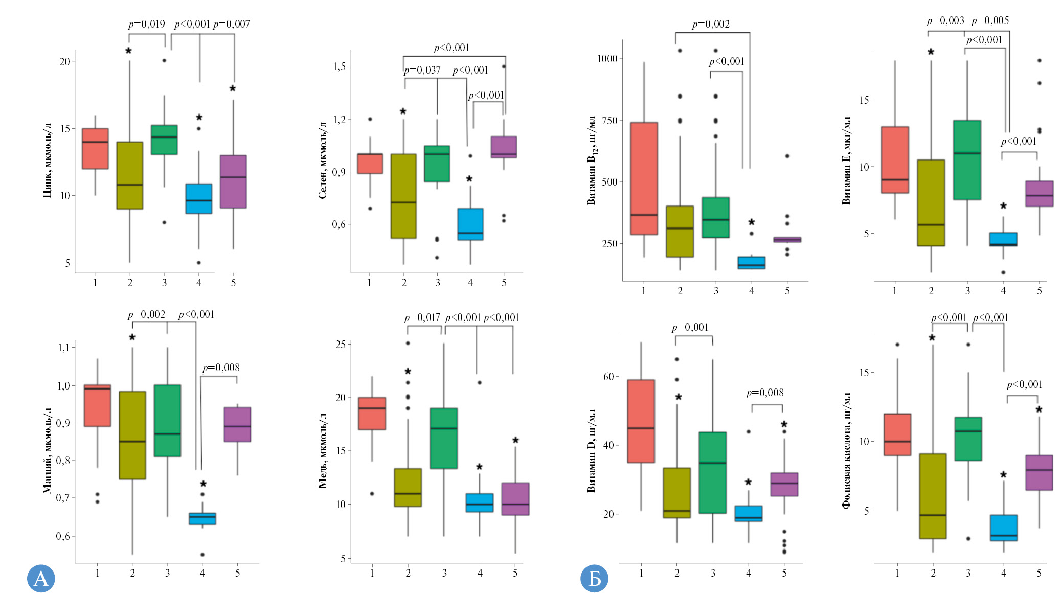 Рис. 2. Количественное содержание микроэлементов (А) и витаминов (Б) в плазме крови пациентов с АА и группы сравнения до и после проведения персонализированной коррекции выявленных микронутриентных изменений: 1 — группа сравнения; 2 — пациенты с АА (общая группа); 3 — пациенты с АА без признака дефицита определенного микронутриента; 4 — группа пациентов с АА с дефицитом определенного микронутриента до начала персонализированной терапии; 5 — группа пациентов с АА с дефицитом определенного микронутриента после завершения персонализированной терапии. Указаны статистически значимые различия (p) между подгруппами пациентов с АА; * — достоверность отличия от группы сравнения (p < 0,05).