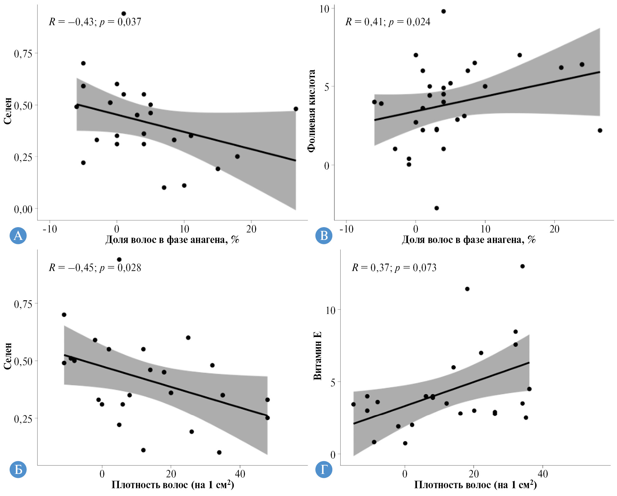 Рис. 3. Корреляционные зависимости, связывающие изменения доли волос в фазе анагена (А, В) и плотности волос (Б, Г) после проведения персонализированной консервативной терапии АА с достигнутым повышением содержания в плазме крови фолиевой кислоты (В), витамина Е (Г) и Se (А, Б)