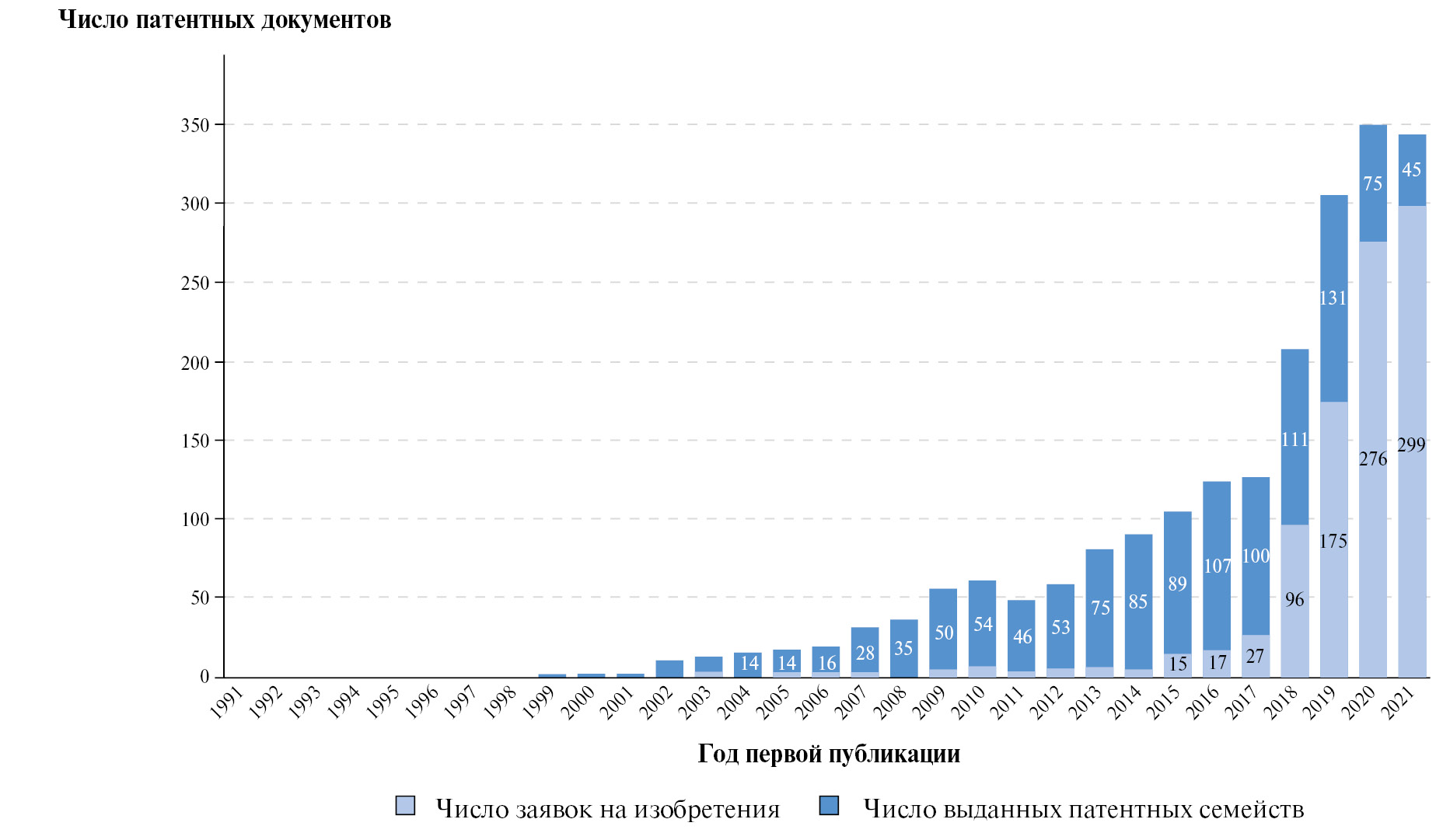 Обнаружено 2892 патентных документа, связанных с направлением «Цифровой двойник в медицине и здравоохранении», из которых 1152 приходится на уже выданные патенты (и патентные семьи), а 949 — на патентные заявки на изобретение. На рис. 1 отражена динамика патентования в исследуемой области техники, которая демонстрирует экспоненциальный рост начиная с 2017 г. Количество ежегодно подаваемых патентных заявок увеличилось в 10 раз (с 27 в 2017 г. до 276 в 2020-м). Отмеченный тренд сохраняется и в 2021 г.: количество патентных заявок на конец сентября 2021 г. уже достигло 299.