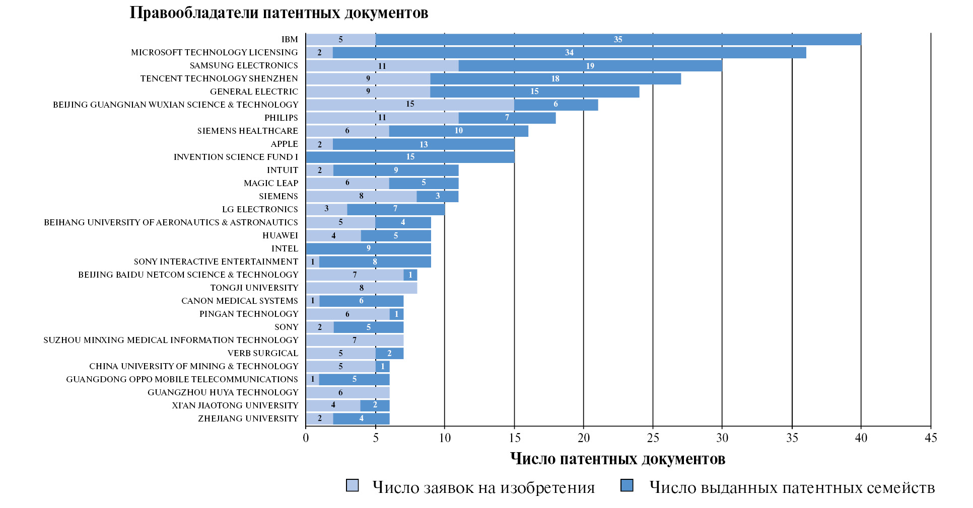 В табл. 1 представлен топ-30 патентообладателей мира по направлению «Цифровой двойник в медицине и здравоохранении», в число которых включено всего четыре университета Китая. Ни одна российская компания или университет не вошли в перечень обладателей заметных коллекций патентов в этой области.