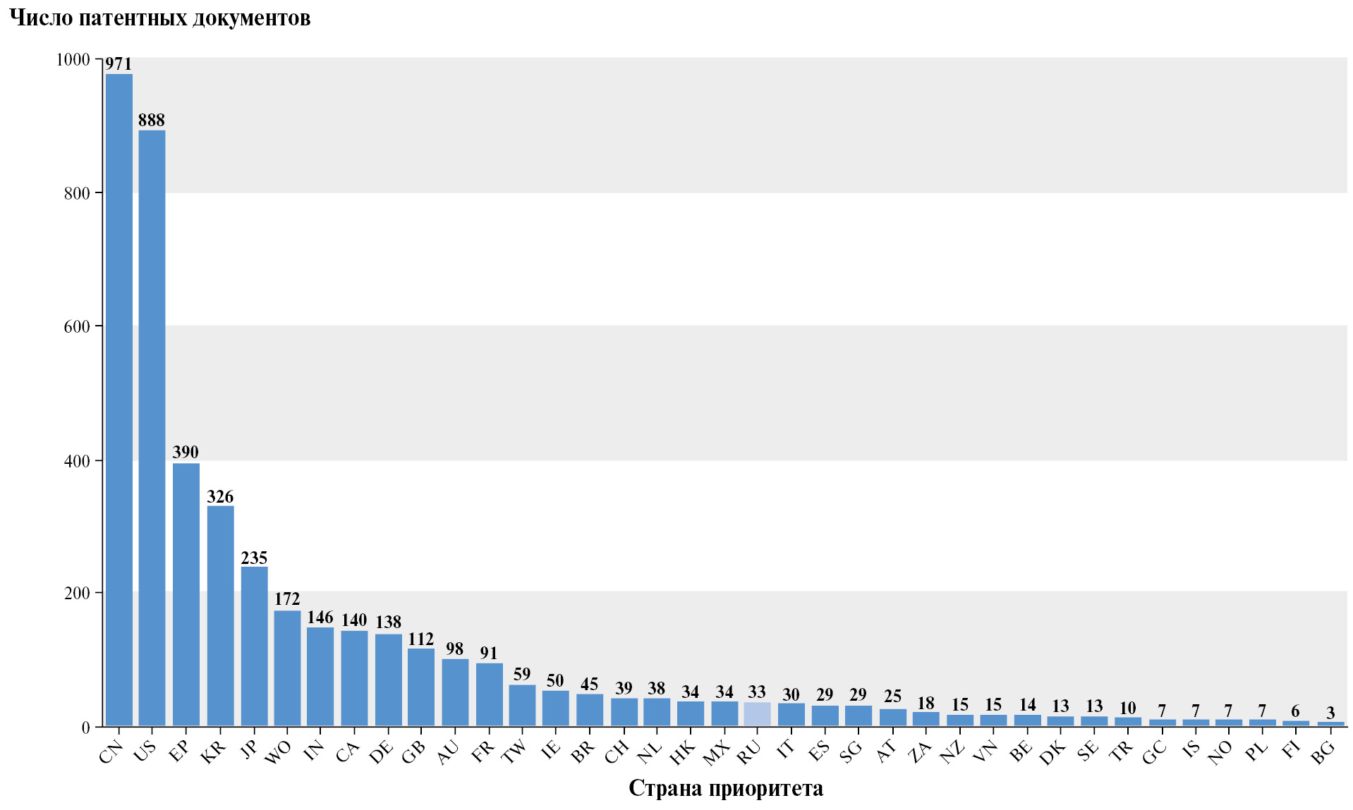 Рис. 3. Распределение патентов направления «Цифровой двойник в медицине и здравоохранении» по странам приоритета.