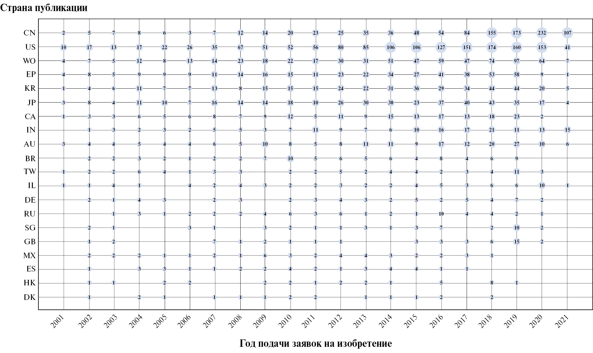 С целью уточнения конкурентного ландшафта, созданного технологией цифровых двойников в медицине и здравоохранении, выполнен патентный анализ с использованием базы данных «ORBIT QUESTEL» и поискового образа (((digital twin+) or (Virtual twin+) or (digital D patient+) or (Virtual D Patient+) or avatar+ or (twin+ model)) F (medic+ or +health+ or surg+ or transplant+ or clinic+ or hospital+ or heart+ or lung+ or knee+ or (patient data) or (patient record+) or human+ or doctor+ or pharmac+ or treatment or therap+ or oncolog+ or immune+ or drug+ or disease+ or cardio+or nursing))/TI/AB/CLMS AND APD >= 2001