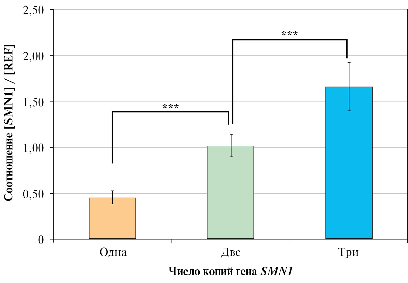 Рис. 1. Диапазоны значений для одной, двух и трех копий гена SMN1 после проведения ПЦР-РВ. *** — p < 0.05