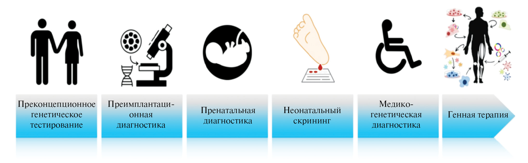 Для наиболее эффективной профилактики СМА необходим комплекс мер по обнаружению мутаций в гене SMN1, который бы охватывал уровни преконцепционного генетического тестирования, преимплантационной диагностики, пренатальной диагностики, неонатального скрининга, а также медико-генетической диагностики пациентов с последующим подбором оптимальной терапии (рис. 2). На каждом из этих этапов существуют осложнения, которые могут нарушить точность анализа, и именно многоуровневая профилактика СМА способна максимально снизить вероятность появления больных, страдающих тяжелыми формами заболевания.