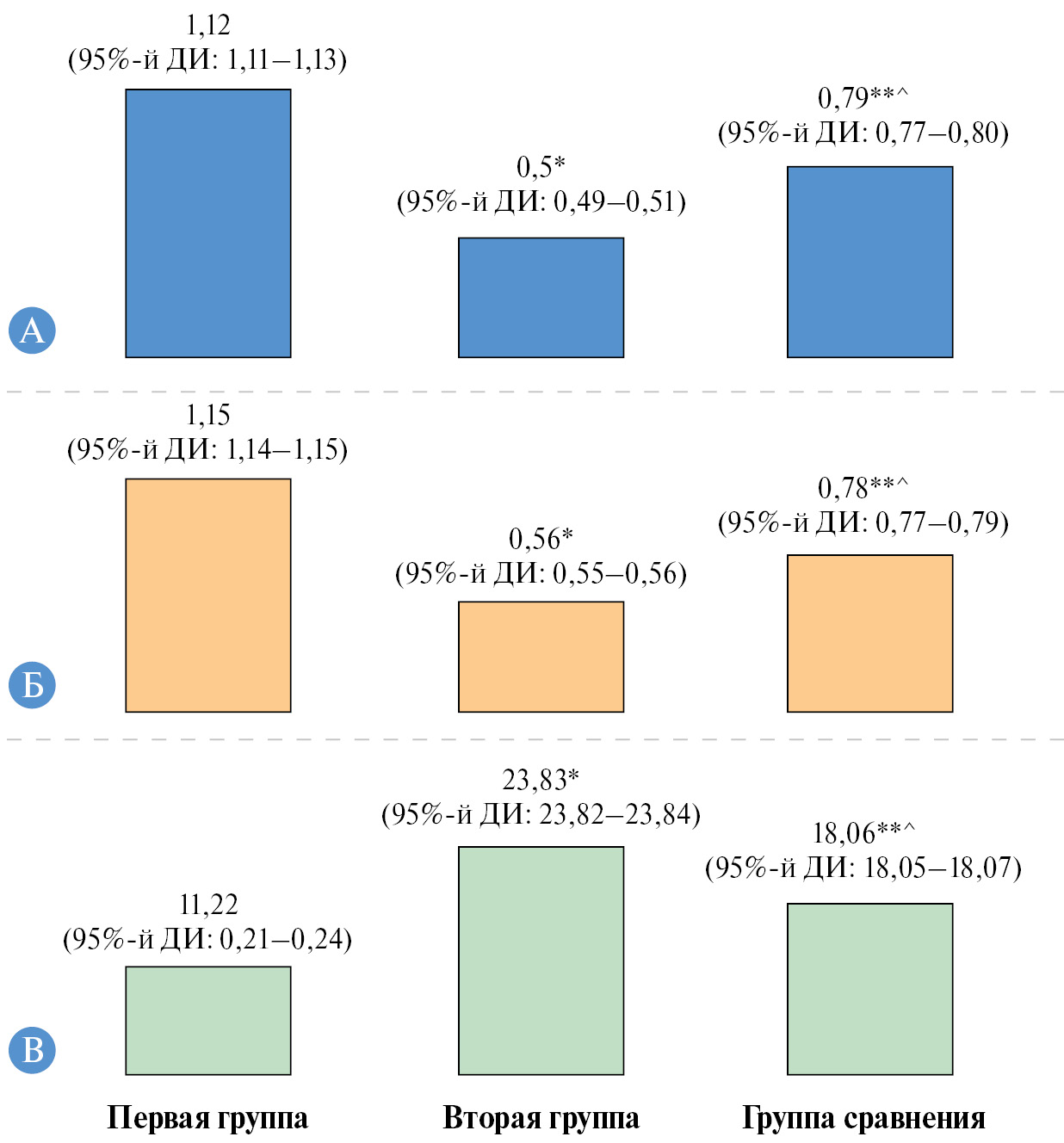 Рис. 1. Количество эндокринных клеток в слизистой оболочке сигмовидной кишки, продуцирующих мотилин (А), вазоактивный кишечный полипептид (Б) и соматостатин (В), на 1 мм2. Первая группа — пациенты с синдромом раздраженного кишечника с диареей (n = 44); вторая группа — пациенты с синдромом раздраженного кишечника с запором (n = 41); группа контроля — n = 36. * p < 0,05 между первой и второй группами; ** p < 0,05 между первой и третьей группами; ^ p < 0,05 между второй и третьей группами.