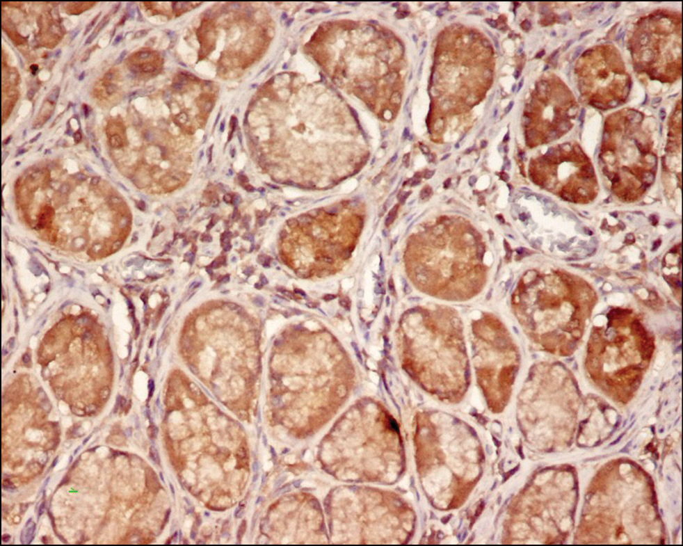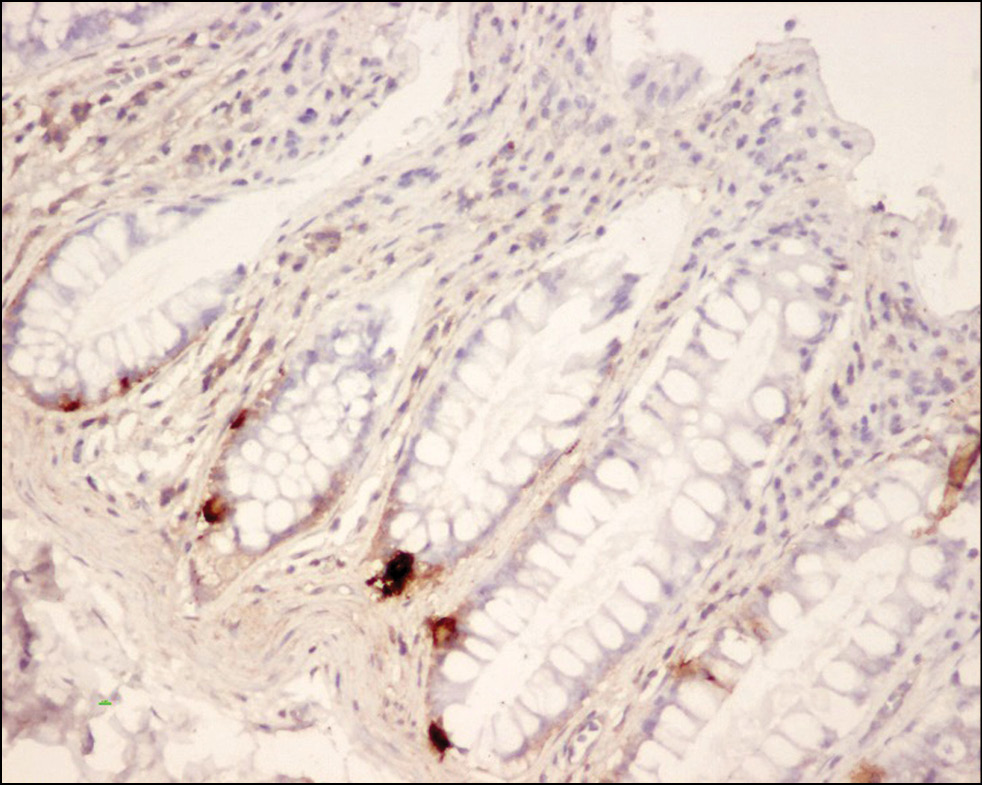 Рис. 2. Сигмовидная кишка больного с синдромом раздраженного кишечника с запором. Иммуногистохимический метод (× 200). Вазоактивный кишечный полипептид в клетках слизистой оболочки толстого кишечника