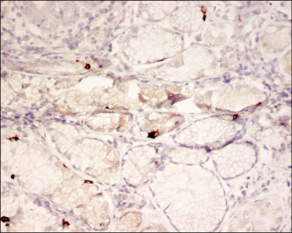 Рис. 3. Сигмовидная кишка больной с синдромом раздраженного кишечника с запором. Иммуногистохимический метод (× 200). Мотилин в клетках слизистой оболочки толстого кишечника