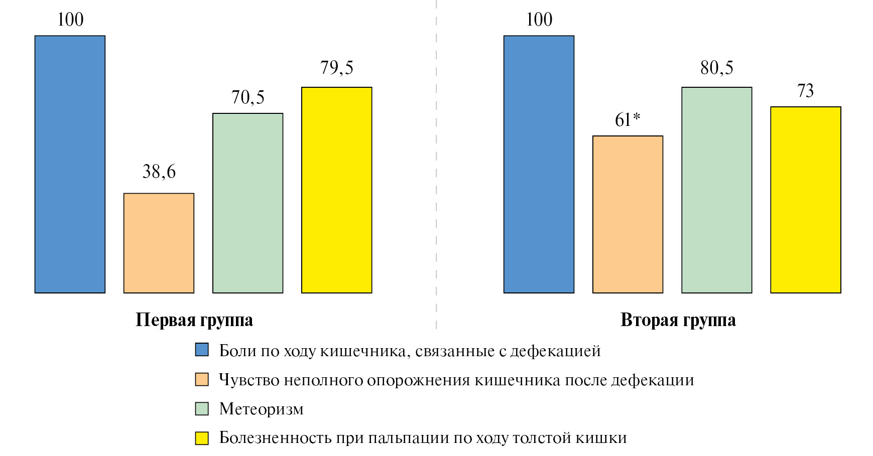 Рис. 5. Анализ степени выраженности клинических симптомов синдрома раздраженного кишечника в исследуемых группах, %. Первая группа — пациенты с синдромом раздраженного кишечника с диареей (n = 44); вторая группа — пациенты с синдромом раздраженного кишечника с запором (n = 41). * p < 0,05 между первой и второй группами