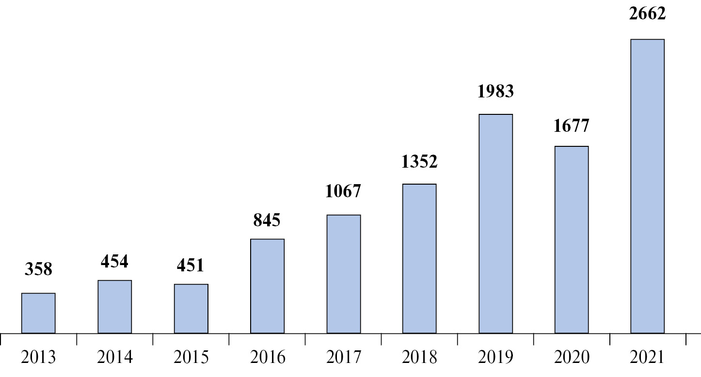 Рис. 1. Динамика количества молекулярно-генетических исследований, выполненных на базе ФГБУ «НМИЦ онкологии» Минздрава России в 2013–2021 гг.
