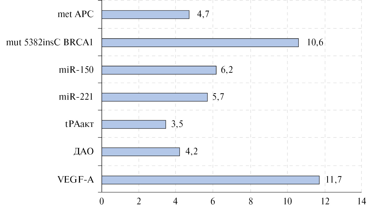В дальнейшем нами были проведены комплексные исследования по обнаружению актуальных прогностических маркеров при РЯ. Анализ профиля метилирования, экспрессии микро-РНК, мутантного статуса некоторых генов, активности биогенных аминов в тканях и концентрации некоторых белков в сыворотке крови (1013 пациенток с РЯ, средний возраст — 53 ± 6,4 года) позволил выявить новые факторы, не зависящие от стадии заболевания: концентрация VEGF-А в ткани яичников, активность ДАО в ткани яичников (tPAакт), повышение экспрессии hsa-miR-221-3p и снижение экспрессии hsa-miR-150-5p, наличие мутации 5382insC гена BRCA1 и гиперметилирования промотора гена АРС (рис. 5).