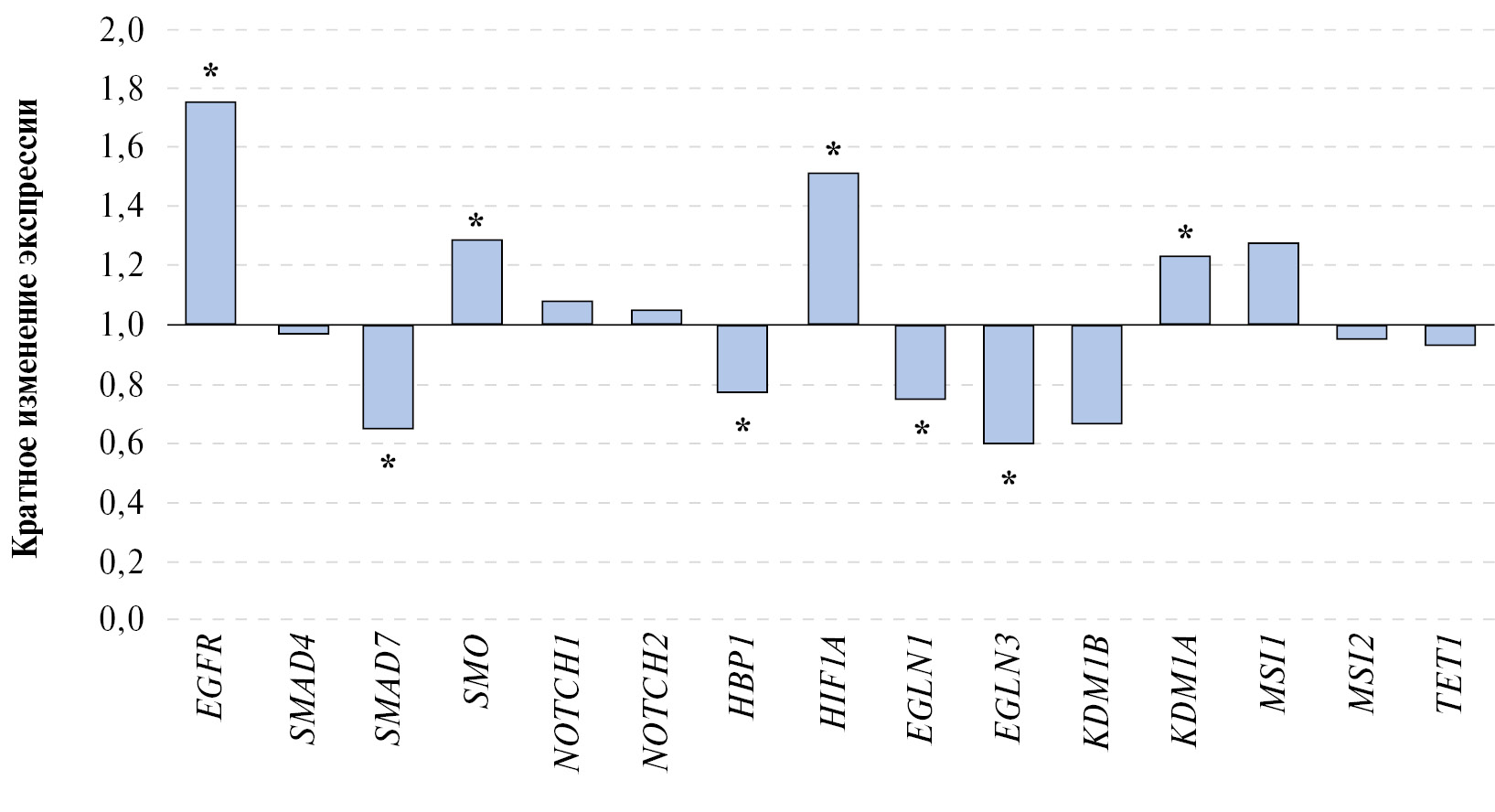 Примечание. * — статистически достоверные изменения экспрессии генов опухолевой ткани относительно неизмененной.
