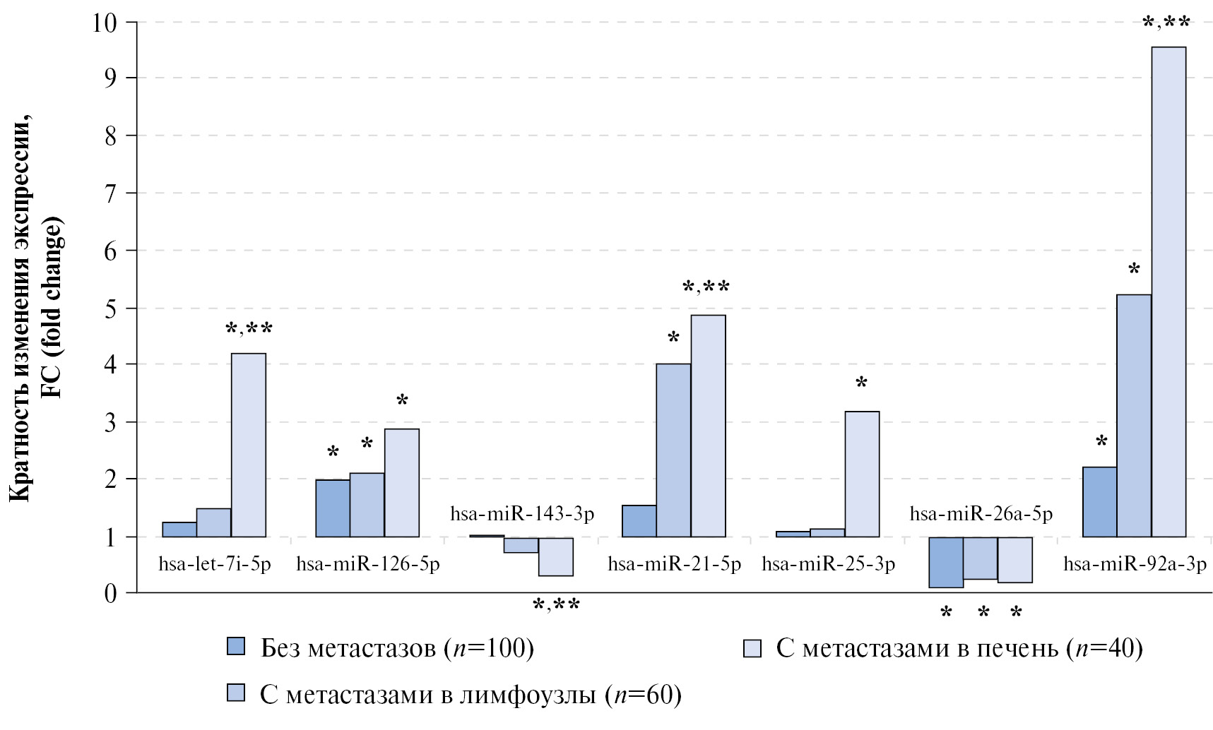 Примечание. * — статистически значимое (p < 0,0005) отличие от нормальной ткани; ** – статистически значимое (p < 0,005) отличие от группы без метастазов.