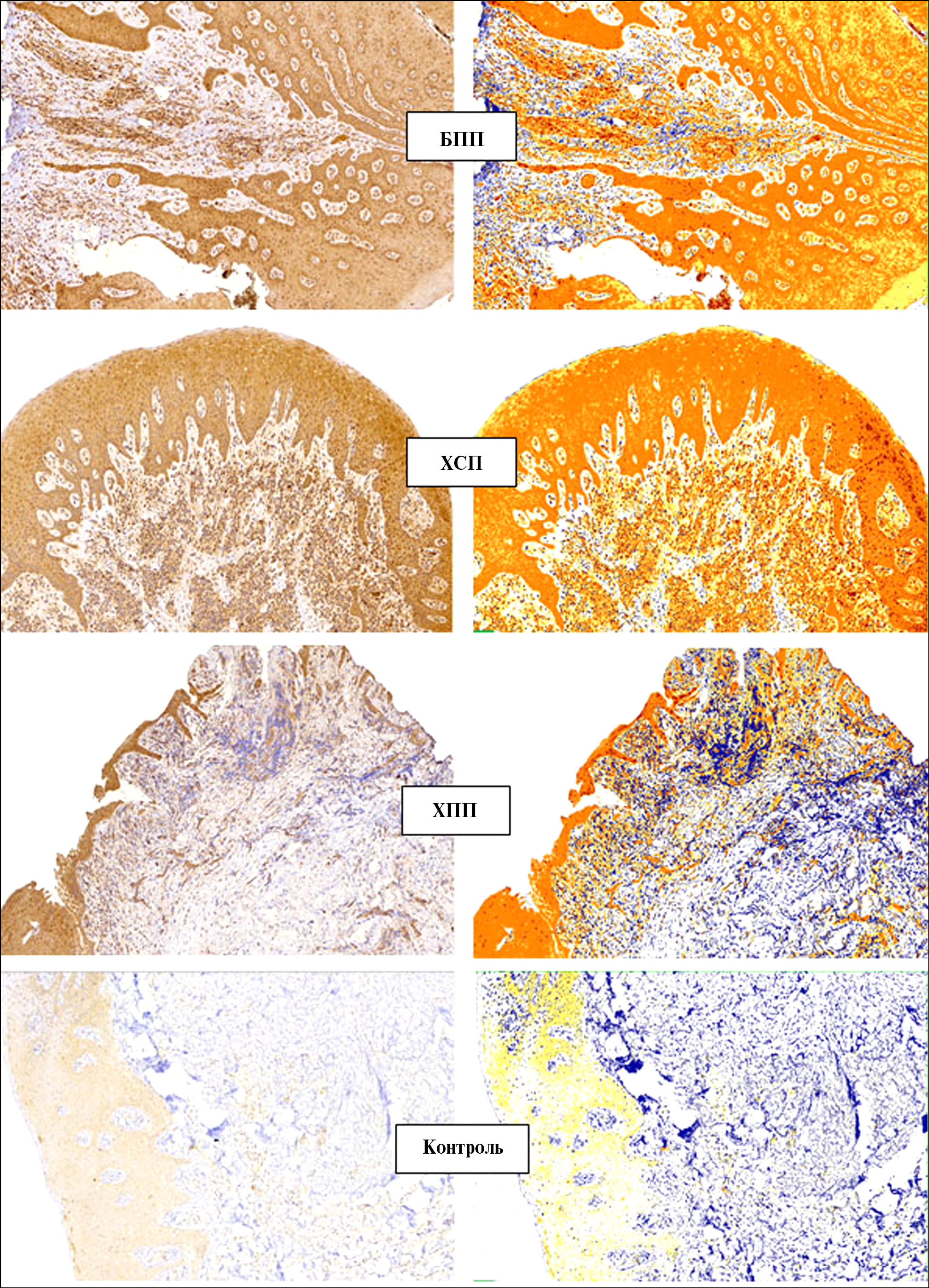 В последующем выполнялось сканирование иммуногистохимических препаратов цифровым слайд-сканером MoticEasyScan с анализом полученных изображений при помощи AperioImageScope v. 12.4.0.5043. Проводилось выделение 9 случайных непересекающихся полей зрения (цифровое увеличение — ×20) с анализом иммуногистохимического окрашивания отдельно в эпителиальном и стромальном компоненте десны, а также полей, включающих в равной пропорции как эпителиальный, так и стромальный компонент (по 3 поля зрения). В рамках программного анализа экспрессии TIMPs в ткани десны интенсивность продуктов реакции диаминбензидина измерялась AperioImageScope автоматически и разделялась на три уровня интенсивности и негативную реакцию. Результат программной оценки параметров позитивности и доли пикселей с высокой и умеренной экспрессией имел прямую взаимосвязь, а интенсивность экспрессии — обратную взаимосвязь с данными визуальной оценки.
