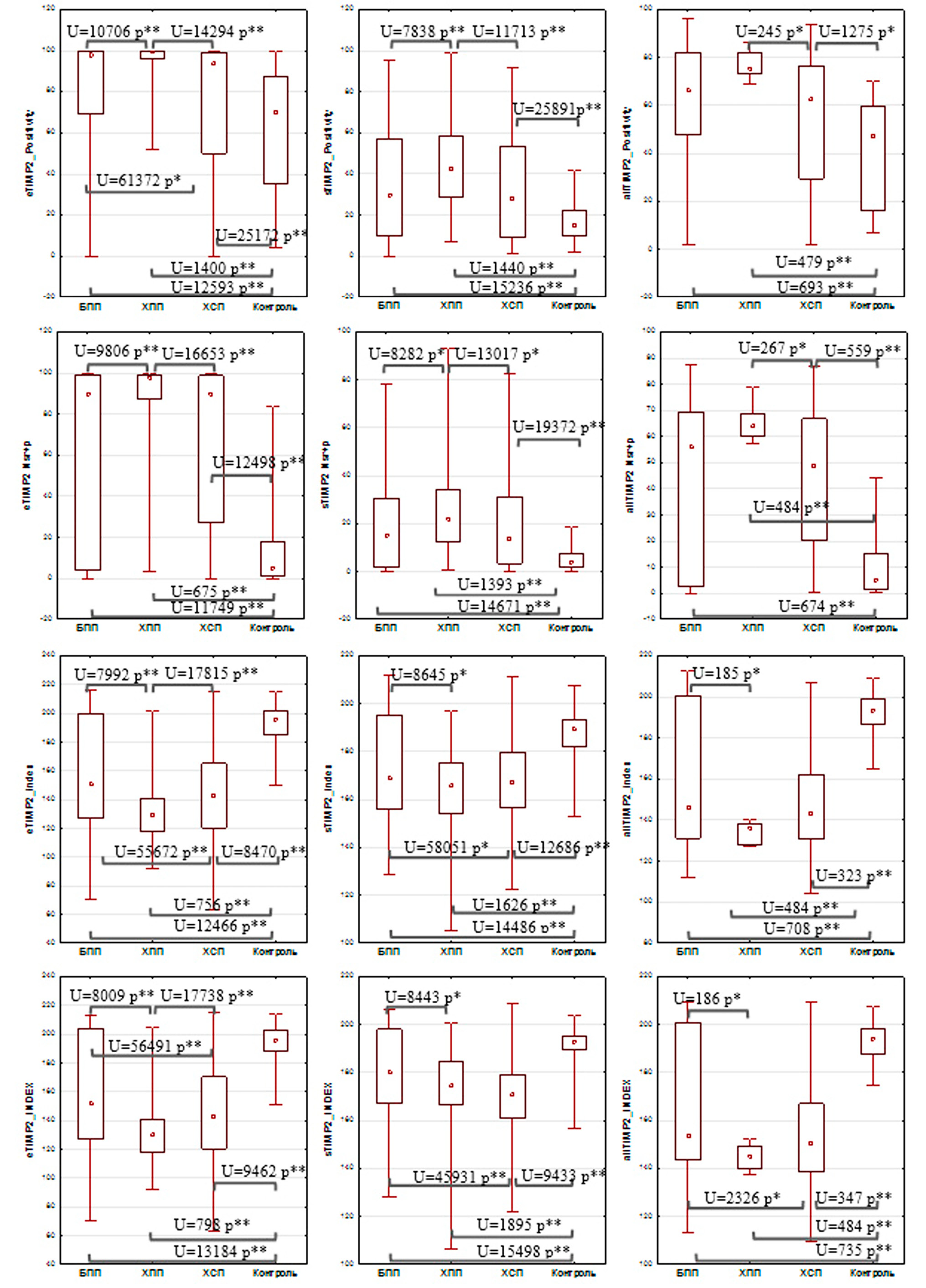 - TIMР2 — позитивность общей экспрессии, общий индекс интенсивности эпителиальной экспрессии и индекс интенсивности эпителиальной экспрессии в иммунопозитивных участках (рис. 6).