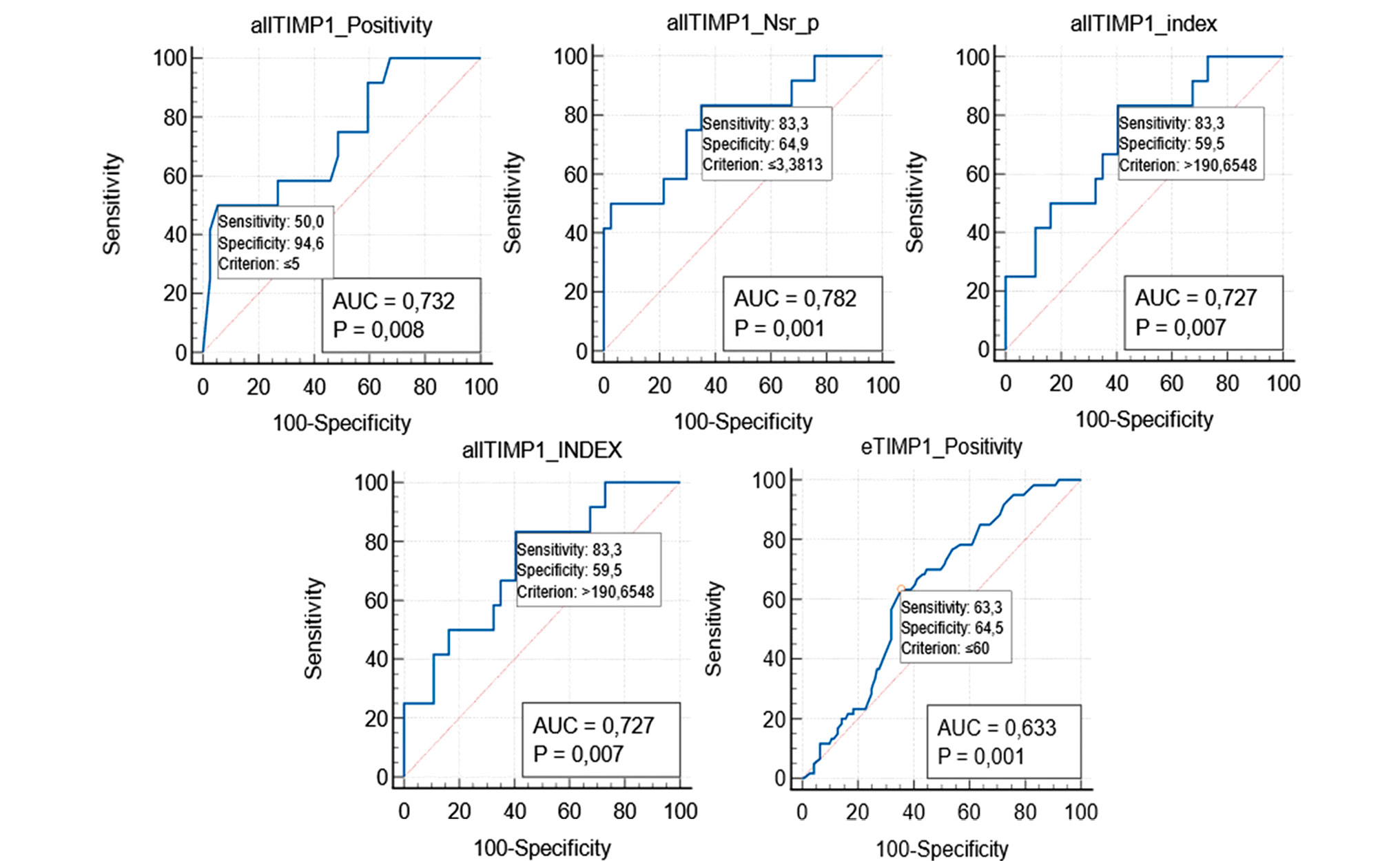 Выполненный ROC-анализ показал, что наиболее информативными параметрами экспрессии TIMP1 и TIMP2 в дифференциальной диагностике пародонтита, особенно на стадии манифестации заболевания, явились показатели общей и эпителиальной экспрессии: