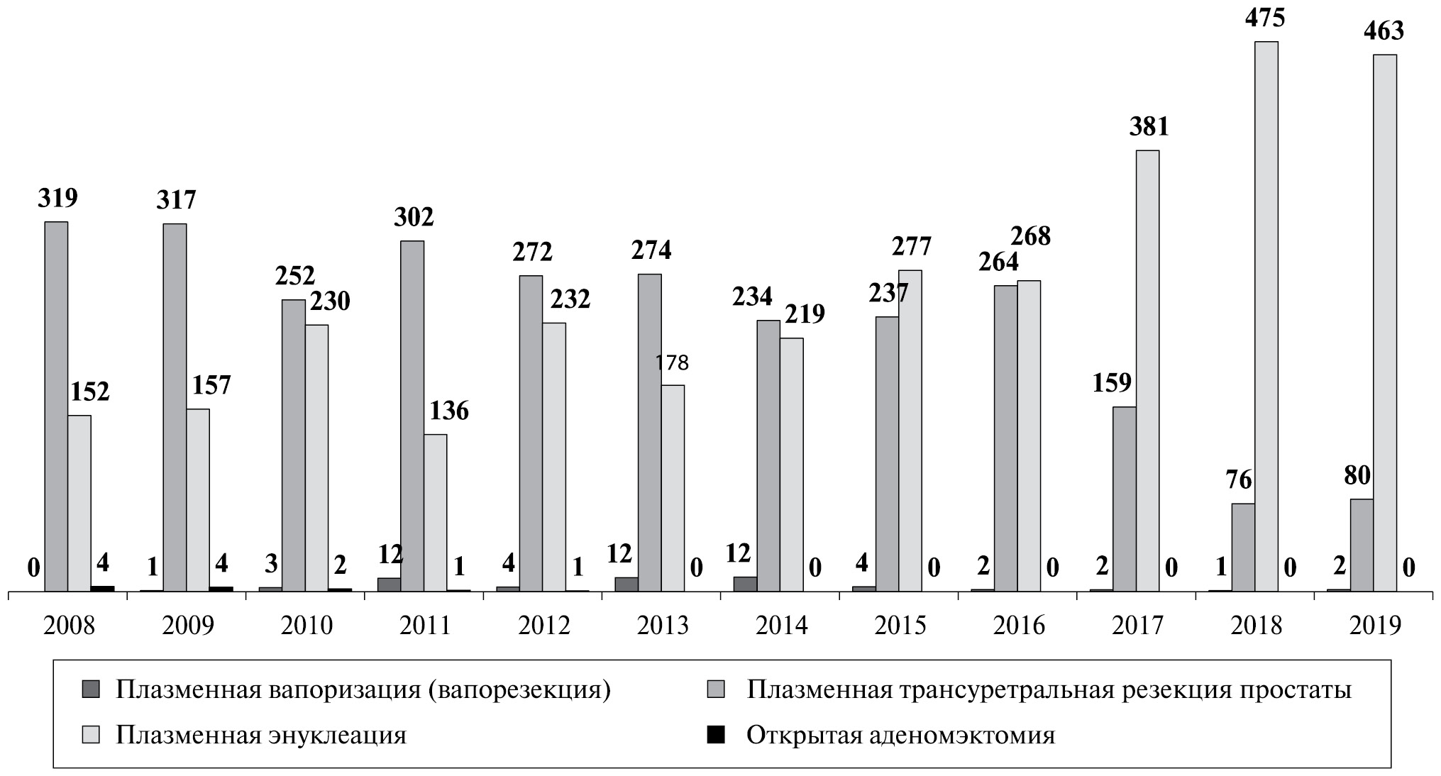 Годом окончания исследования был определен 2019-й, так как в последующее время не было возможности получить достоверную информацию из-за эпидемиологической ситуации в стране в связи с COVID-19. Как показано на рис. 1, доля плазменной трансуретральной энуклеации простаты от числа всех проведенных оперативных вмешательств при ДГП за 12 лет возросла в 3 раза.