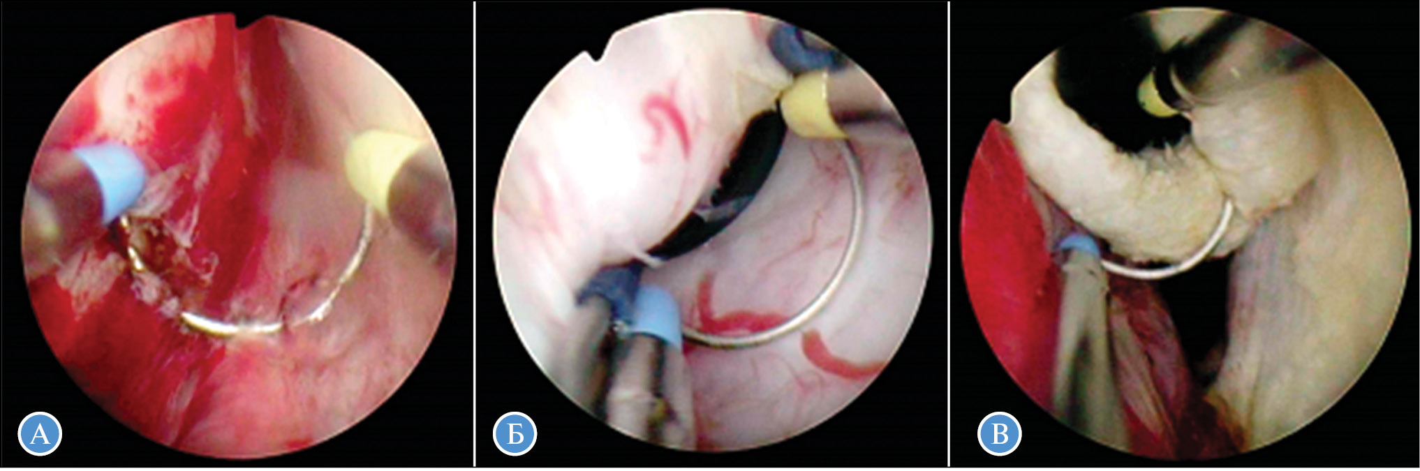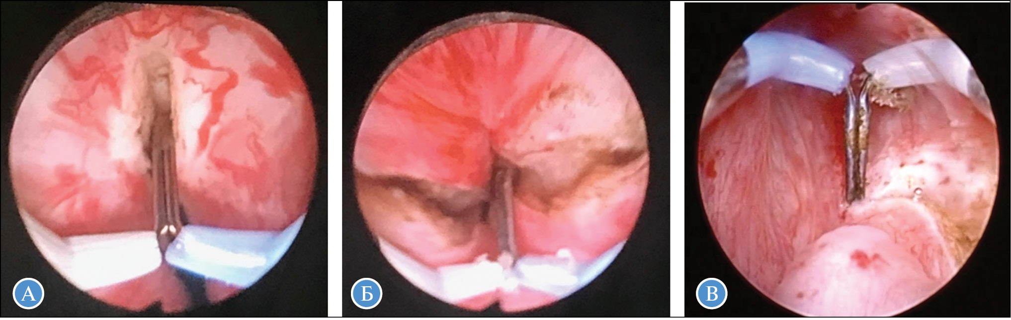 Рис. 2. Основные этапы плазменной трансуретральной энуклеации простаты при доброкачественной гиперплазии простаты больших и гигантских размеров: А — циркулярное рассечение слизистой в области шейки мочевого пузыря и апикальной части; Б — механическое отделение левой доли железы от капсулы; В — резекция вылущенной доли