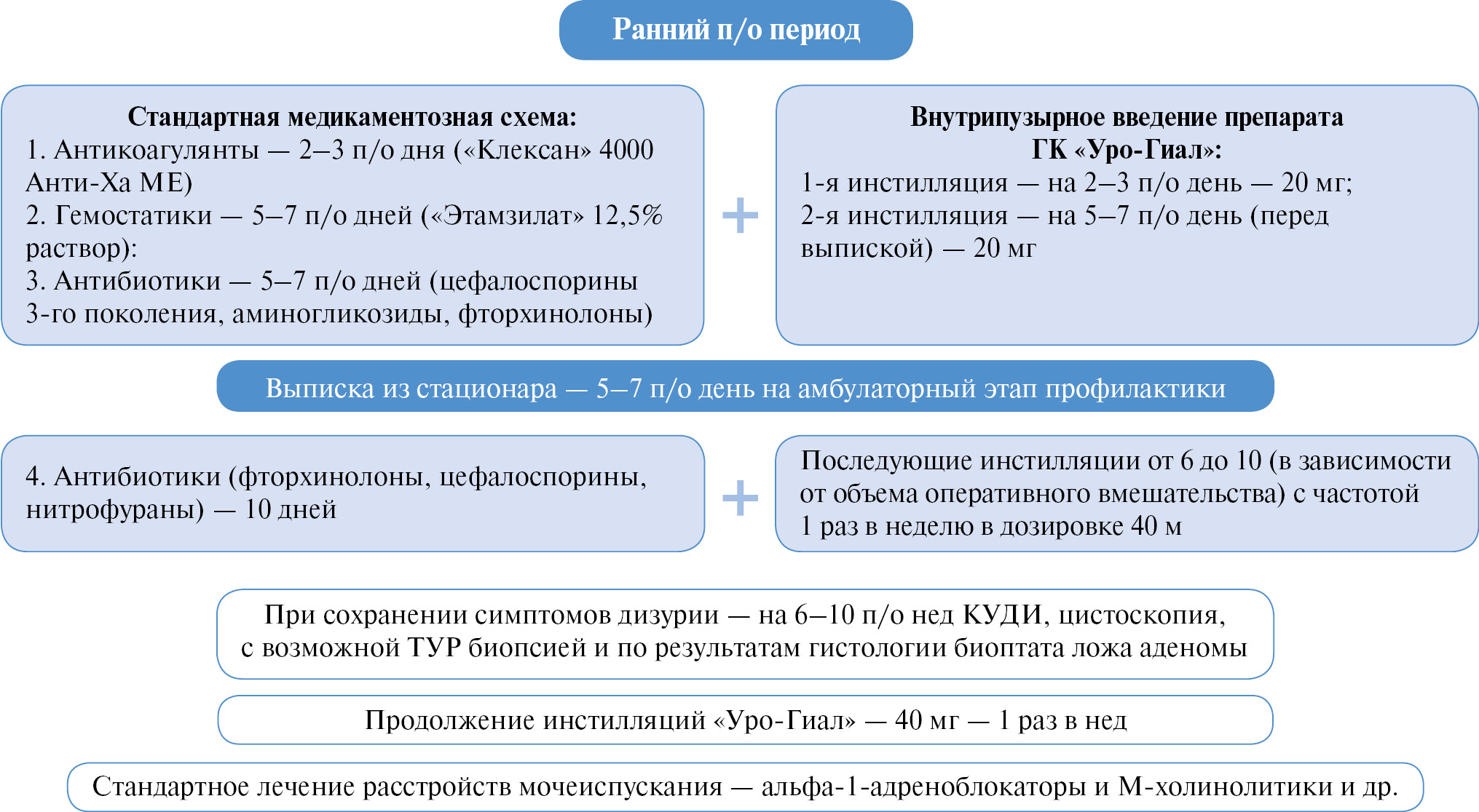 Схема разработана на основе изучения патогенетических механизмов, показаний и результатов применения препарата ГК в урологии для лечения циститов. Раствор ГК применялся в соответствии с инструкцией с периодичностью 1 раз в неделю под гистологическим контролем препаратов, полученных посредством ТУР-биопсии из ложа удаленной ДГП в различные сроки (во время операции, 6-, 8-, 12-,16-, 24-я нед после операции). Схема предусматривает проведение первых двух инстилляций в условиях стационара в половинной дозировке (20 мг / 25 мл) в целях установления безопасности и переносимости препарата и последующих инстилляций — амбулаторно с периодичностью 1 раз в неделю в полной дозировке (40 мг / 50 мл). Время экспозиции раствора в МП — 1,5–2 ч, длительность применения зависит от объема удаленной ДГП. Экспериментально установлено, что для пациентов после П-ТУРП при неосложненных формах ДГП достаточно шести инстилляций препарата, что при кратности их выполнения 1 раз в неделю соответствует 5–6 послеоперационным неделям. После плазменной трансуретральной энуклеации простаты при ДГП большего объема (площадь раневой поверхности ложа удаленной аденомы больше), при осложненных формах ДГП и сочетанных операциях продолжительность применения препарата увеличивается до 9–10 нед (9–10 инстилляций). Комплексная профилактика поздних дизурических и обструктивных осложнений, согласно протоколу, также предусматривает применение стандартной медикаментозной терапии, включающей антибактериальные препараты (цефалоспорины 3-го поколения) и гемостатики в течение пребывания в стационаре, а также антикоагулянты, после выписки в течение 10 дней перорально — антибиотик фторхинолонового ряда.