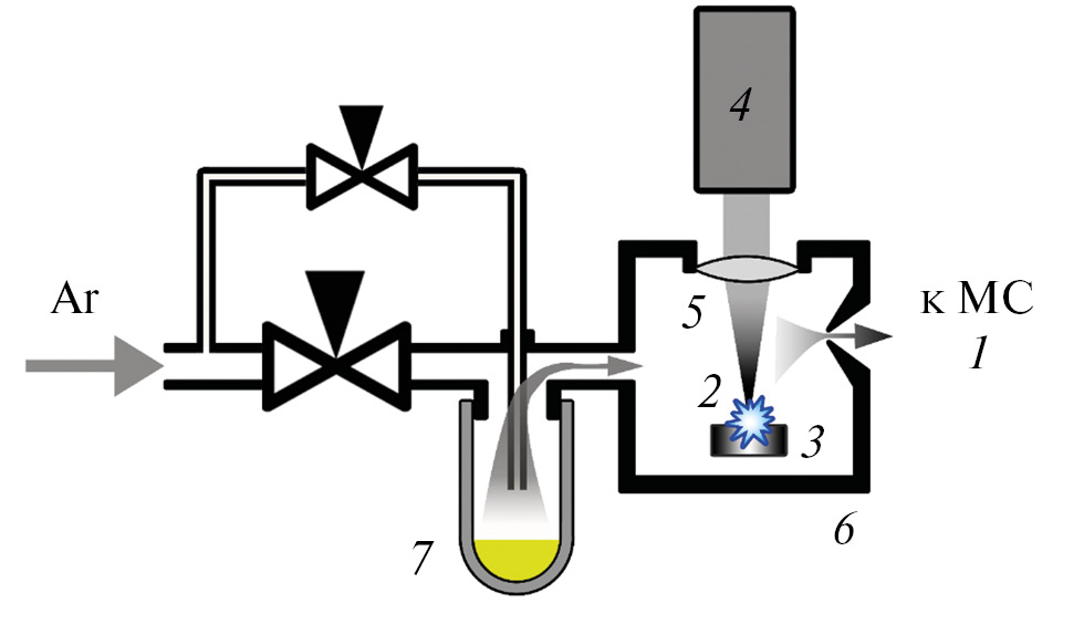 Рис. 1. Схема масс-спектрометра с устройством ввода ЛОС: 1 — времяпролетный масс-спектрометр рефлектрон; 2 — лазерная плазма, создаваемая импульсным излучением лазера; 3 — металлическая мишень; 4 — импульсный Nd: YAG-лазер; 5 — линза с фокусным расстоянием 5 см; 6 — камера ионизации; 7 — пробирка с пробой мочи, установленная на пневморазъем