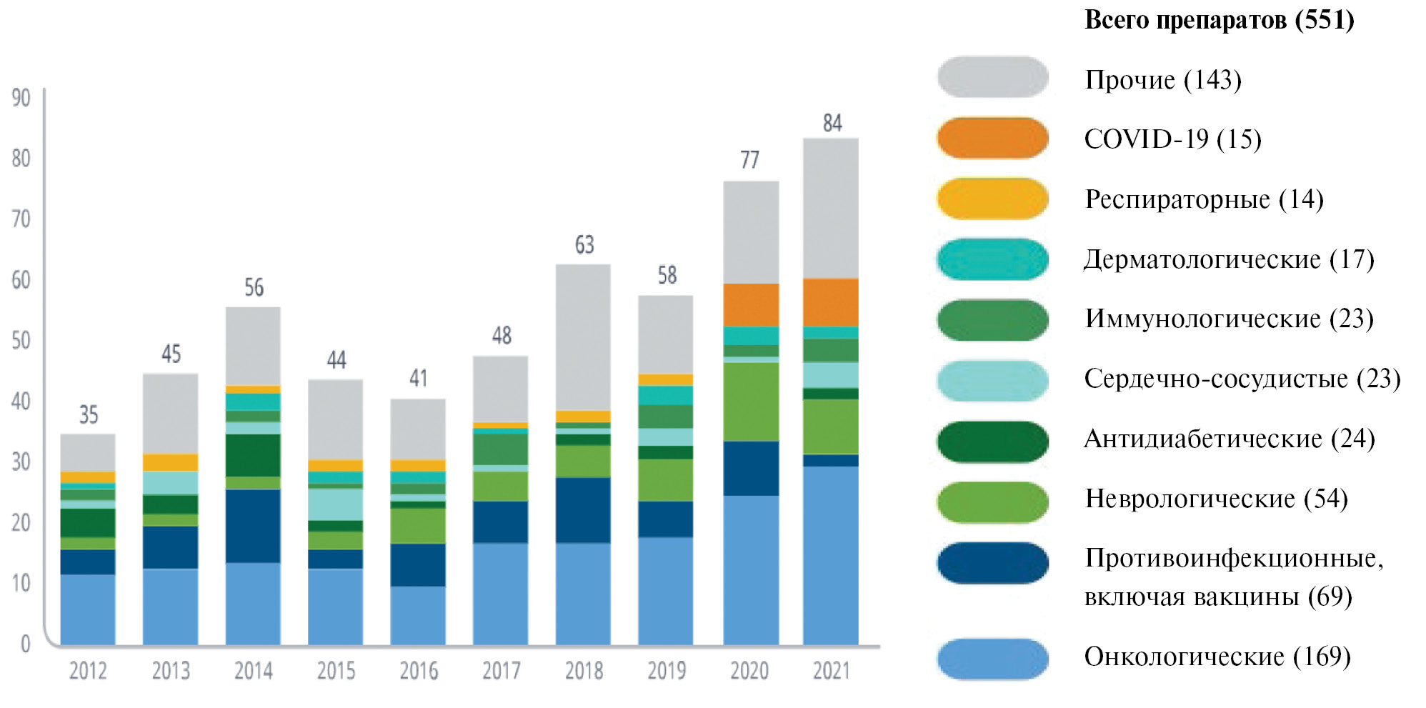 Рис. 1. Структура портфеля новых инновационных препаратов, 2012–2021 гг. [5]