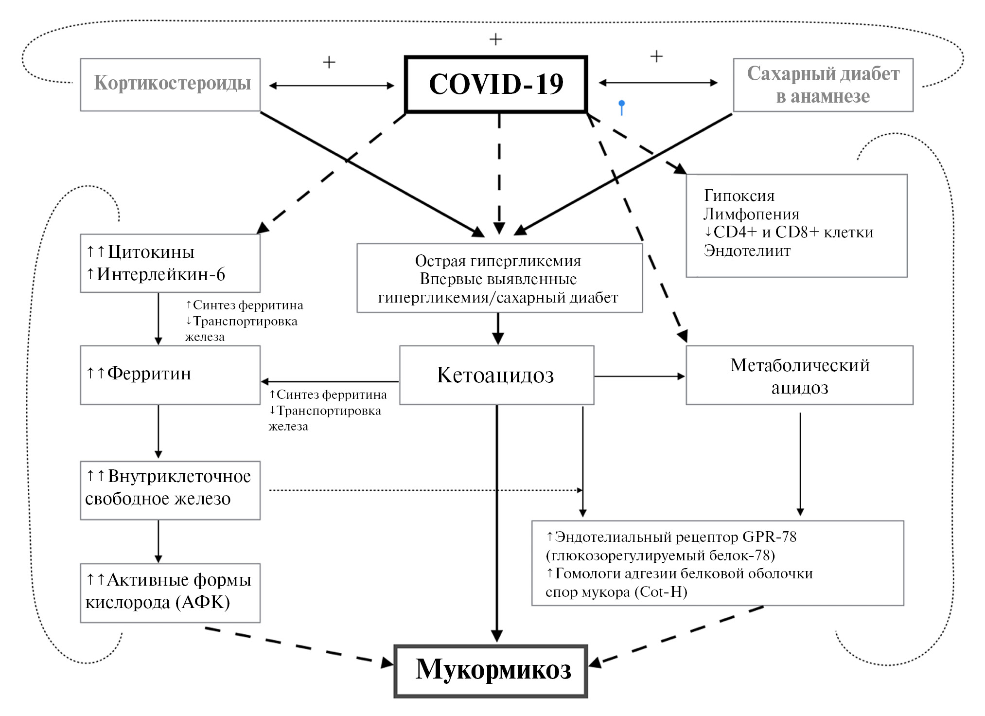 Основные причины, которые способствуют прорастанию спор Mucorales у людей, перенесших COVID-19: среда с низким содержанием кислорода (гипоксия), высоким содержанием глюкозы (диабет, впервые возникшая гипергликемия, гипергликемия, вызванная стероидами); кислая среда (метаболический ацидоз, диабетический кетоацидоз); высокий уровень железа (повышенный уровень ферритинов) и снижение фагоцитарной активности лейкоцитов из-за иммуносупрессии (опосредованные SARS-CoV-2, стероид-опосредованные или сопутствующие заболевания) в сочетании с другими факторами, включая длительную госпитализацию с аппаратом искусственной вентиляции легких или без него. Данная грибковая инфекция возникает в течение 60 дней после начала заражения COVID-19 и рассматривается как ковид-ассоциированный мукормикоз [6]. В обзоре A.K. Singh et al. [7] приводится предполагаемая схема патогенеза мукормикоза у пациентов после перенесенной новой коронавирусной инфекции (рис. 1).