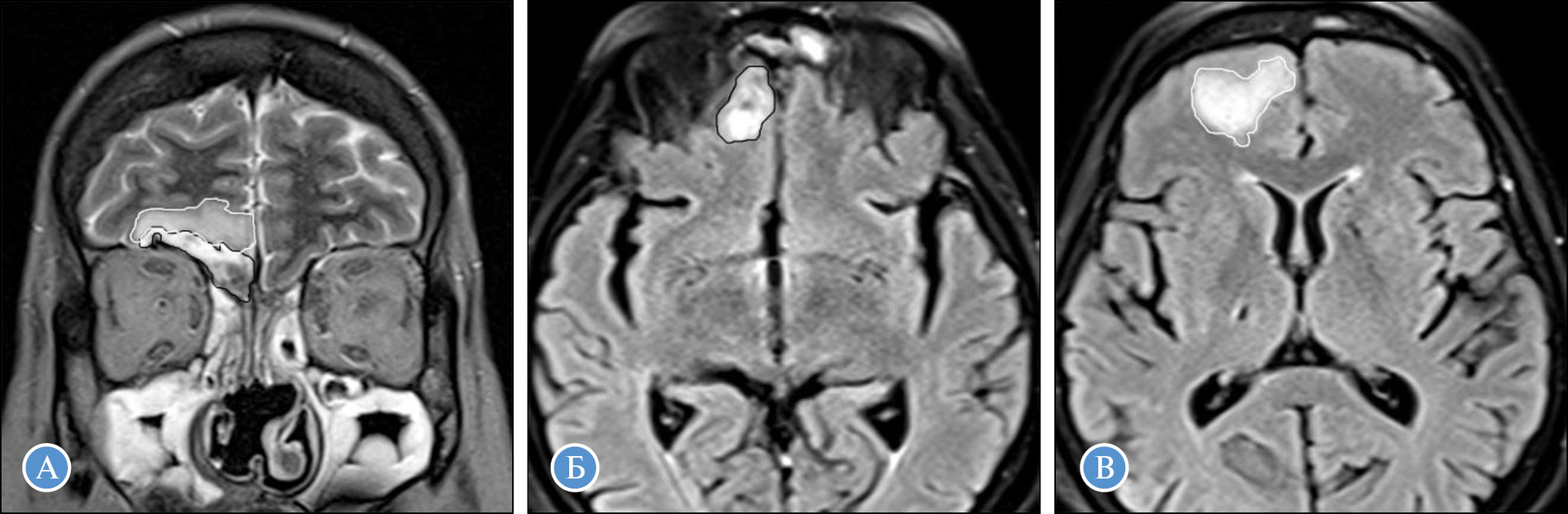 Рис. 6. МРТ головного мозга и околоносовых пазух, корональная плоскость (А), аксиальная плоскость (Б, В): А – Т2-ВИ; Б, В – FLAIR. Отмечается инвазия из пазух носа в полость черепа с вовлечением оболочек и вещества мозга. Зона менингоэнцефалита (черный контур) имеет неоднородный гиперинтенсивный МР-сигнал на Т2-ВИ и FLAIR. По периферии зоны энцефалита определяется отек вещества мозга (белый контур)