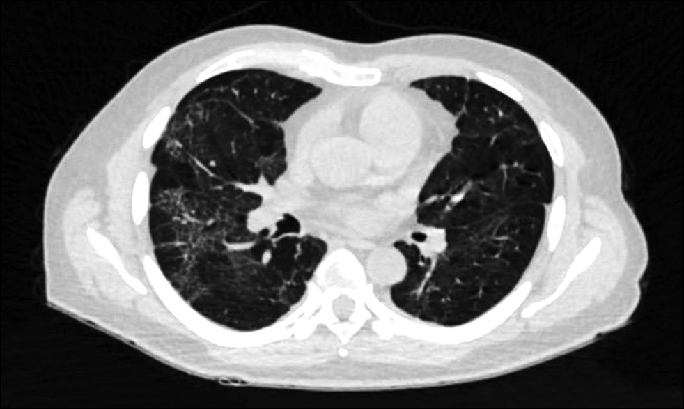 Рис. 7. КТ органов грудной клетки, аксиальная плоскость. С обеих сторон отмечаются остаточные изменения двусторонней вирусной пневмонии — интерстициальные изменения и криволинейные уплотнения легочной ткани