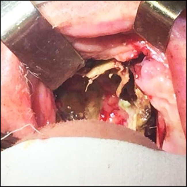 Под контролем эндоскопа 0° с помощью прямых кусачек, щипцов Блексли и распатора удалялась единым блоком перегородка до живых тканей. Далее переходили к клеткам решетчатого лабиринта и удаляли все некротизированные ткани и фрагменты костных деструктивных изменений до здоровых участков. Резецировали измененный задний конец нижней носовой раковины и убирали некротизированную среднюю носовую раковину, переднюю стенку клиновидной пазухи и утолщенную слизистую оболочку с целью визуализации внутрипазушных структур, изменений задней и нижней стенки пазухи. Внутрипазушную перегородку скусывали угловыми кусачками. С помощью угловой оптики 45° и изогнутых кусачек удаляли медиальную стенку пораженной верхнечелюстной пазухи, убирали слизистую оболочку с участками некроза и патологическое содержимое. Вскрывали орбиту под контролем 3D-КТ-визуализации со стороны медиального угла глаза и решетчатой кости. Убирали пораженную заднюю стенку верхнечелюстной пазухи и обозревали фасцию крылонебной ямки, которая часто была поражена и также удалялась с помощью кусачек. Верхнечелюстная и нисходящая небная артерии при необходимости коагулировались с помощью биполярного коагулятора. Пораженная жировая ткань крылонебной ямки также удалялась. При наличии некроза в области твердого неба и верхней челюсти приглашались челюстно-лицевые хирурги.