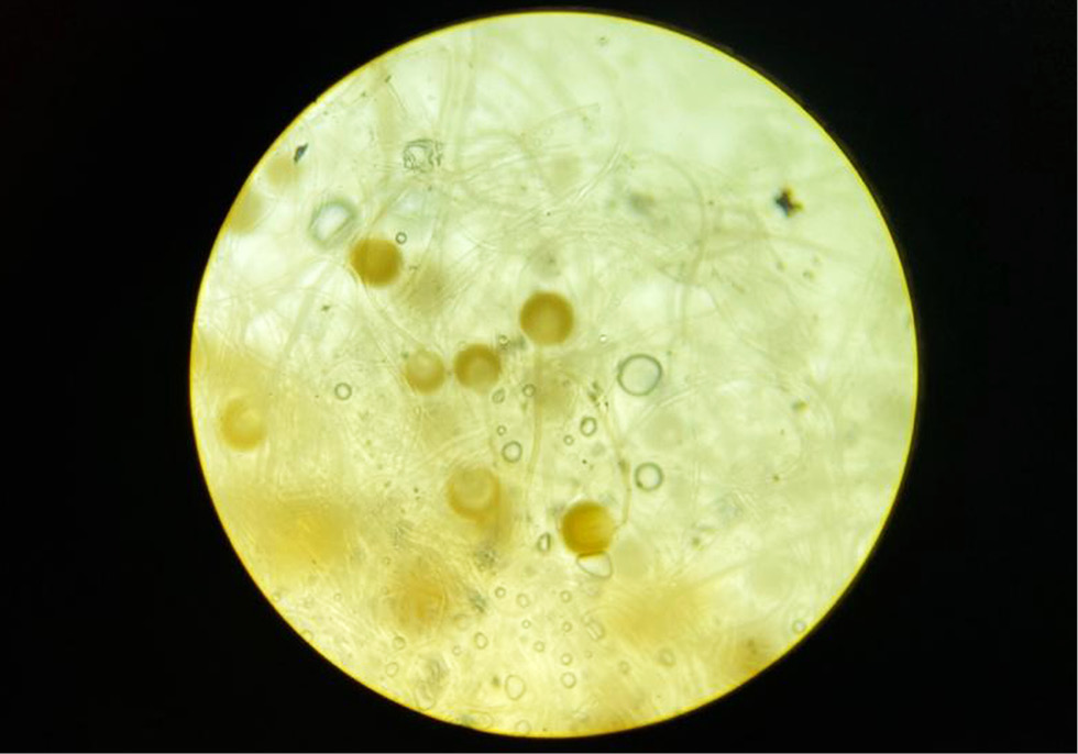 Для родовой идентификации исследуемых грибов применялся микроскопический метод. Препараты приготавливались методом «раздавленная капля»: на предметное стекло наносили каплю жидкости, приготовленную из равных частей глицерина, этилового спирта и дистиллированной воды, в которую помещался кусочек колонии гриба, вырезанный микологической лопаткой; далее препараты накрывались покровным стеклом и проводилась микроскопия при увеличении 100× и 400×. Дополнительно приготовленные препараты изучались методом люминесцентной микроскопии путем добавления в них калькофлюора белого, который связывается с полисахаридами клеточных стенок грибов (хитином, целлюлозой), что впоследствии проявляется свечением при микроскопии с использованием светофильтров. При оценке микроскопической картины выявлены признаки, характерные для микромицет из Mucor spp.: обнаружен широкий (до 20 мкм) несептированный мицелий, ветвящийся под прямым углом, и длинные (до 400 мкм) спорангиеносцы, оканчивающиеся шаровидными буроватыми спорангиями до 60 мкм в диаметре (рис. 12).
