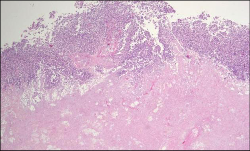 Рис. 13. Окраска — гематоксилин и эозин. 50×. В нижней части препарата — гомогенизированная эозинофильная слизистая оболочка с некрозом и наложениями по поверхности гнойного экссудата