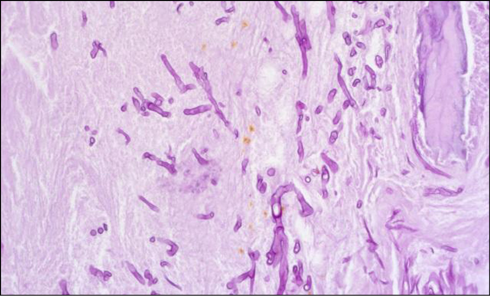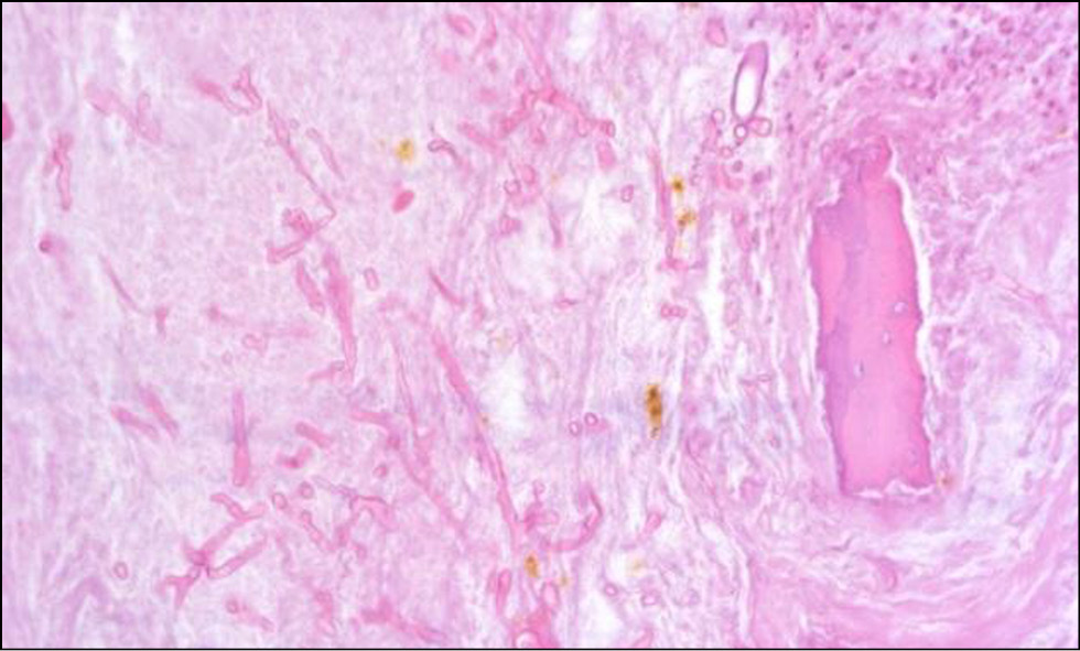 Для оценки патологического процесса исследован материал, взятый из некротизированных участков. Образец ткани фиксирован в 10%-м растворе забуференного формалина. Костные фрагменты после фиксации декальцинировались 1 сут в электролитном декальцинирующем растворе соляной и муравьиной кислот. Процессинг материала (обезвоживание, обезжиривание и пропитка парафином) осуществлен с применением автоматического вакуумного гистопроцессора Leica ASP200, образец залит в парафиновый блок с помощью станции заливки Thermo Scientific HistoStar, на ротационном микротоме Leica RM2265 изготовлены срезы с парафинового блока толщиной 4 мкм, окрашены гематоксилином-эозином по стандартной методике, а также ШИК-реакцией (PAS) и импрегнацией серебром по Грокотт для обнаружения мицелия грибов. Оценка окрашенных микропрепаратов проводилась методом световой микроскопии с использованием микроскопа Zeiss AxioLab.A1.