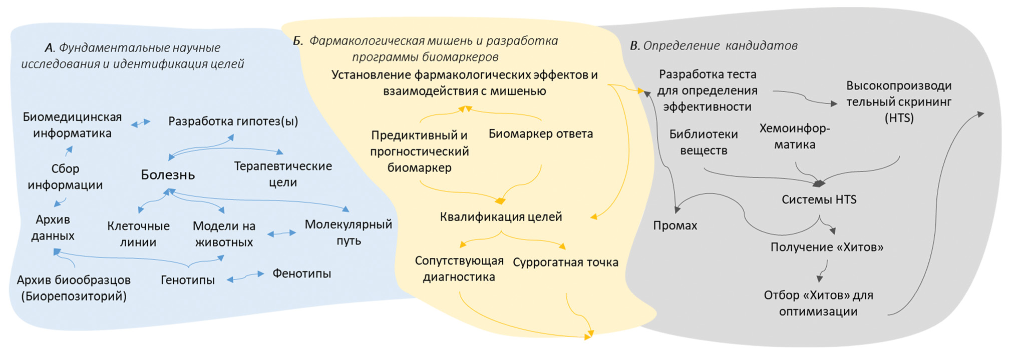 На следующем этапе обычно определяют фармакологическую мишень и разрабатывают программу биомаркеров. В данном контексте фармакологическая мишень рассматривается с точки зрения первичных и вторичных фармакологических эффектов, которые потенциально можно ожидать от вещества, обладающего прогнозируемым механизмом действия (молекулярный механизм действия). Под первичной фармакодинамикой понимают специфическое фармакологическое действие и механизм основного фармакологического эффекта, что в совокупности определяет терапевтическую эффективность. Вторичные эффекты возникают в результате не всегда высокой избирательности взаимодействия вещества с мишенью и его возможного влияния на похожие структуры, что обусловливает развитие побочных, плейотропных или нейтральных эффектов [5]. В планируемом проекте разрабатывается программа выявления и оценки выраженности фармакологических эффектов, степени взаимодействия вещества с мишенью и терапевтической ценности разрабатываемого лекарственного препарата, для чего определяют несколько групп биомаркеров. Прогностические биомаркеры раскрывают течение заболевания, и на основе их анализа можно прогнозировать исход процесса вне зависимости от проведения терапии [6, 7]. По наличию предиктивных (предсказывающих) маркеров определяют условия, способствующие высокому или низкому ответу на введение разрабатываемого препарата, которые необходимо учитывать для снижения вероятности получения ложноположительных и ложноотрицательных трактовок результатов исследований. Биомаркер ответа можно определить как явление, наличие которого свидетельствует о возникновении биологического ответа на введение разрабатываемого средства. После определения набора методов оценки первичной/ вторичной фармакодинамики и разработки системы биомаркеров целесообразно провести квалификацию целей (определить приоритетные цели и уровень прогностического потенциала успешности разрабатываемого средства в случае их достижения). Это завершается определением суррогатных конечных точек (важно отметить их важную роль в формировании маркетингового плана развития лекарственного средства, поскольку их оценка может стать основанием для открытия терапевтической ниши или ключевых преимуществ) в будущих клинических исследованиях. Помимо этого, определяют необходимость разработки сопутствующей диагностики, которая представляет собой медицинское изделие, часто — для диагностики in vitro, т.е. для получения информации, необходимой для без-опасного и эффективного использования соответствующего лекарственного средства (потенциальные серьезные побочные эффекты или риски) [8, 9].