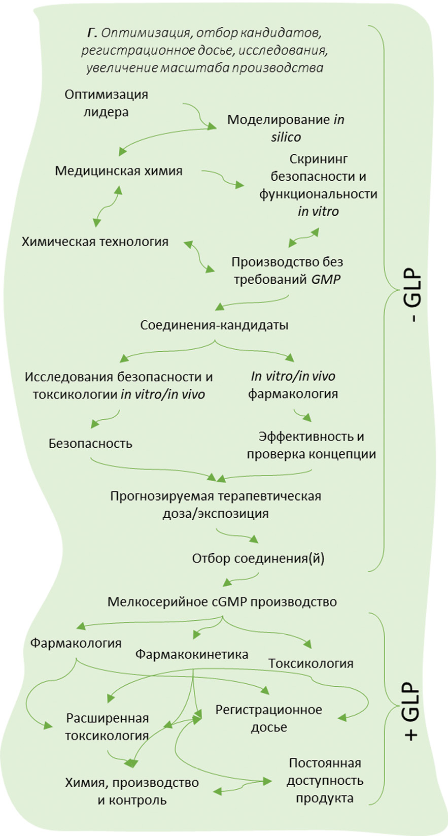 Отобранную молекулу(ы) пытаются оптимизировать, применяя методы компьютерного моделирования и прогнозирования, после чего ее синтезируют и, запуская параллельную программу оптимизации химического синтеза, в исследованиях in vitro оценивают безопасность и функциональность (рис. 1). Для отобранной молекулы разрабатывают технологию получения опытных образцов (без требований стандартов GMP), которые в последующем используют для оценки фармакодинамики и токсикологии в исследованиях in vitro/in vivo без следования стандартам GLP. На основе полученных результатов оценивают эффективность, терапевтический потенциал и перспективность выбранной концепции, после чего определяют прогностическую терапевтическую дозу и требуемую экспозицию для соединений, которые будет необходимо произвести мелкосерийными партиями готовых образцов с соблюдением стандартов GMP и которые будут исследовать по стандартам GLP [13].