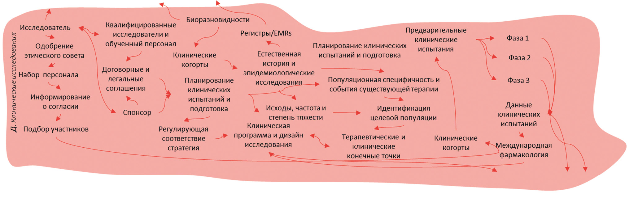 Спонсор (физическое или юридическое лицо) инициирует клиническое исследование (КИ) и несет полную ответственность за его организацию и/или финансирование (рис. 3). Договорные, легальные отношения оформляются между спонсором и контрактной исследовательской организацией/исследователями, имеющими квалифицированный персонал, и регламентируют планирование, подготовку и проведение исследований. Исследователи имеют доступ к биомедицинской информации (информатики), архиву данных и биорепозиторию, при этом все полученные в ходе работ материалы передаются на хранение. В обязанности исследователя также входят организация получения одобрения совета по этике, подбор персонала, сбор и подписание информированных согласий, отбор и включение в исследование, формирование когорт пациентов, проведение испытаний (предварительные, I–III фазы). Данные, полученные в ходе этих КИ, архивируются и должны быть обнародованы, в том числе для совершенствования будущих клинических программ и разработки новых дизайнов КИ. Разработка дизайна и протокола КИ осуществляется с учетом описанных выше моментов, естественной истории и эпидемиологических исследований (исходы, частота и степень тяжести заболевания), в результате идентифицируют целевую популяцию, терапевтические и клинические конечные точки, достижение или недостижение которых определяет успех или неудачу лекарственного препарата и его одобрение к широкому применению.