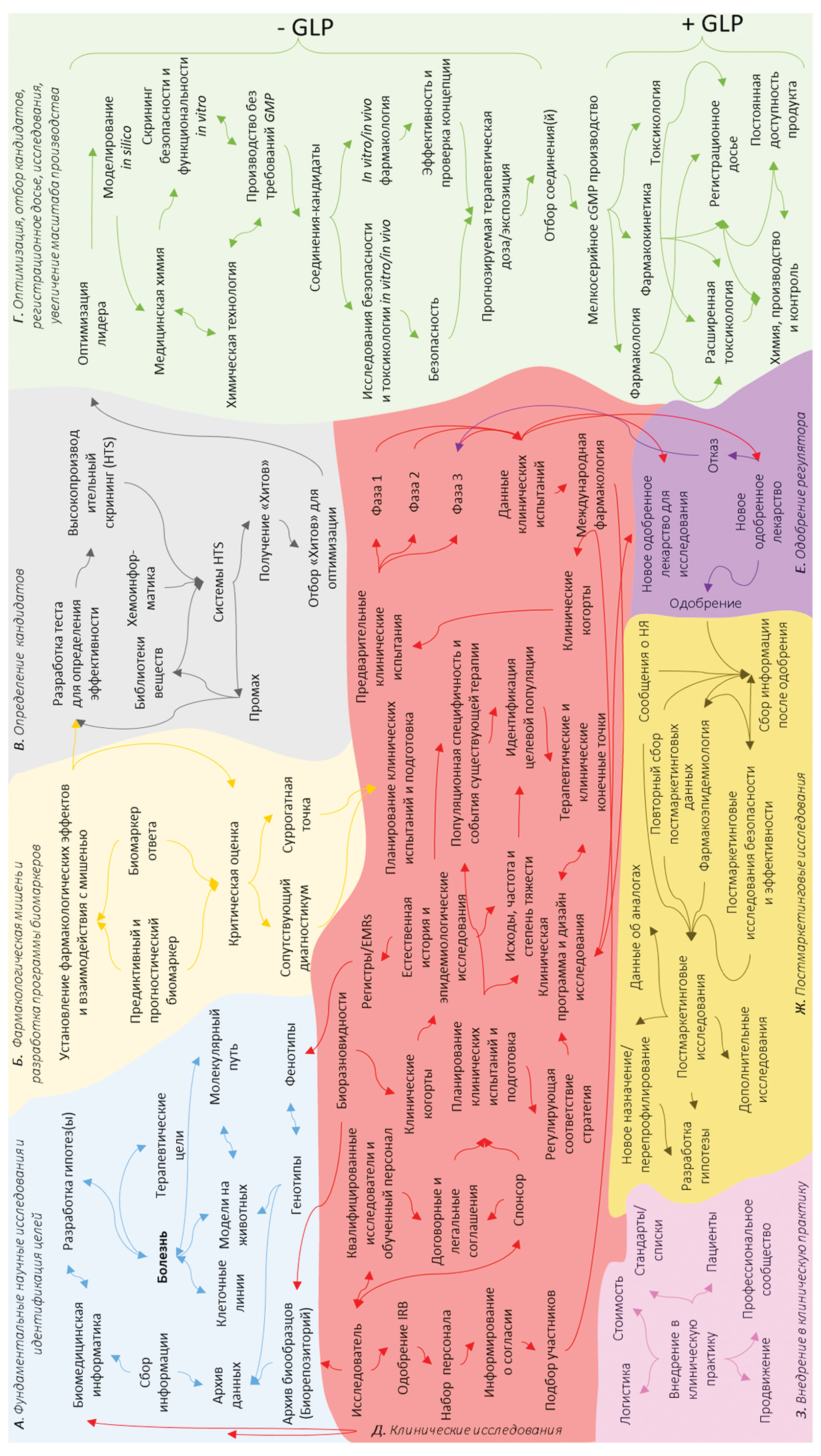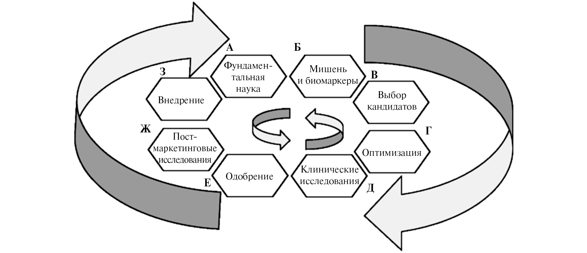 Рис. 6. Схема и связь этапов разработки оригинальных лекарственных средств на основе малых молекул