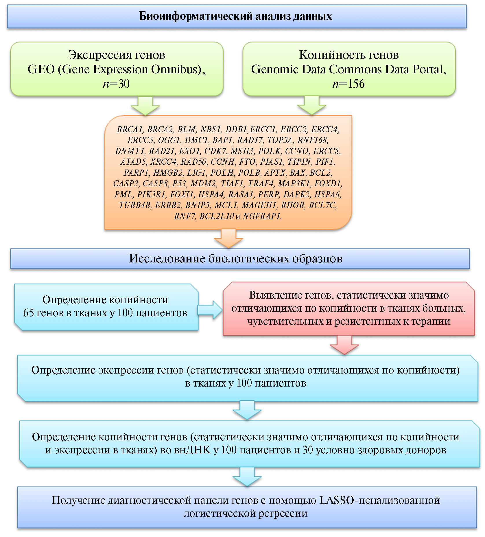 Перечень дифференциально-экспрессирующихся генов сравнивался с данными по копийности. Коррекция на групповой эффект (batch effect) осуществлялась с помощью пакета SVA (язык R). В экспериментальную часть работы были включены только локусы, имеющие сонаправленные изменения экспрессии и копийности.