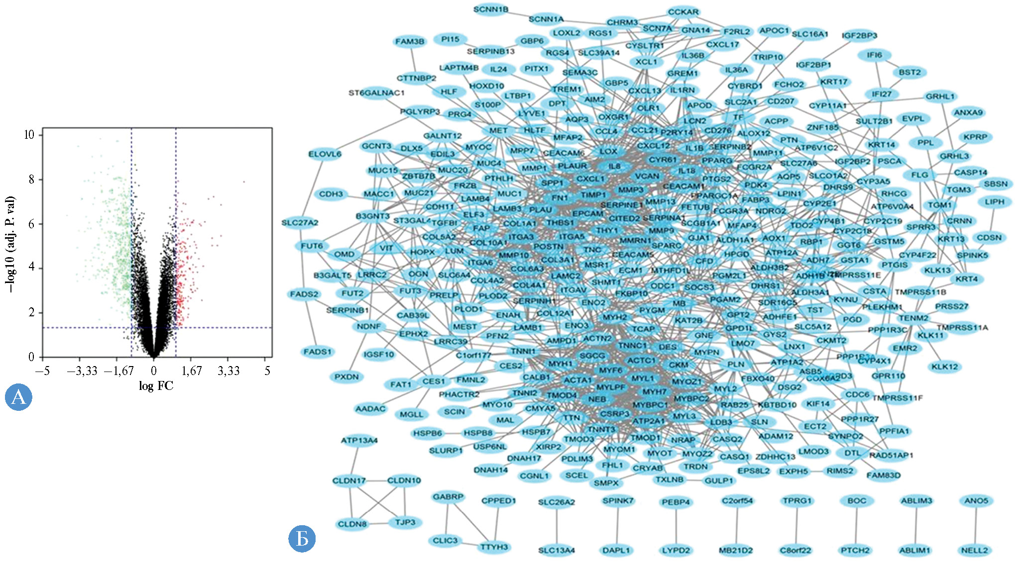 Рис. 2. «Вулкан плот» и сеть PPI DEG: A — DEG были выбраны с кратным изменением ≥ 2 или ≤ –2 и скорректированным p-значением < 0,05. Зеленая точка показывает, что экспрессия гена в опухоли была вдвое меньше, чем в нормальных тканях, тогда как красная точка — что экспрессия гена в опухоли более чем в 2 раза выше относительно нормальных тканей (p < 0,05). Черные точки представляют гены, которые не считались дифференциально экспрессируемыми; Б — сеть PPI DEG была построена с использованием Cytoscape, PPI — белок-белковое взаимодействие, DEG — дифференциально экспрессируемые гены