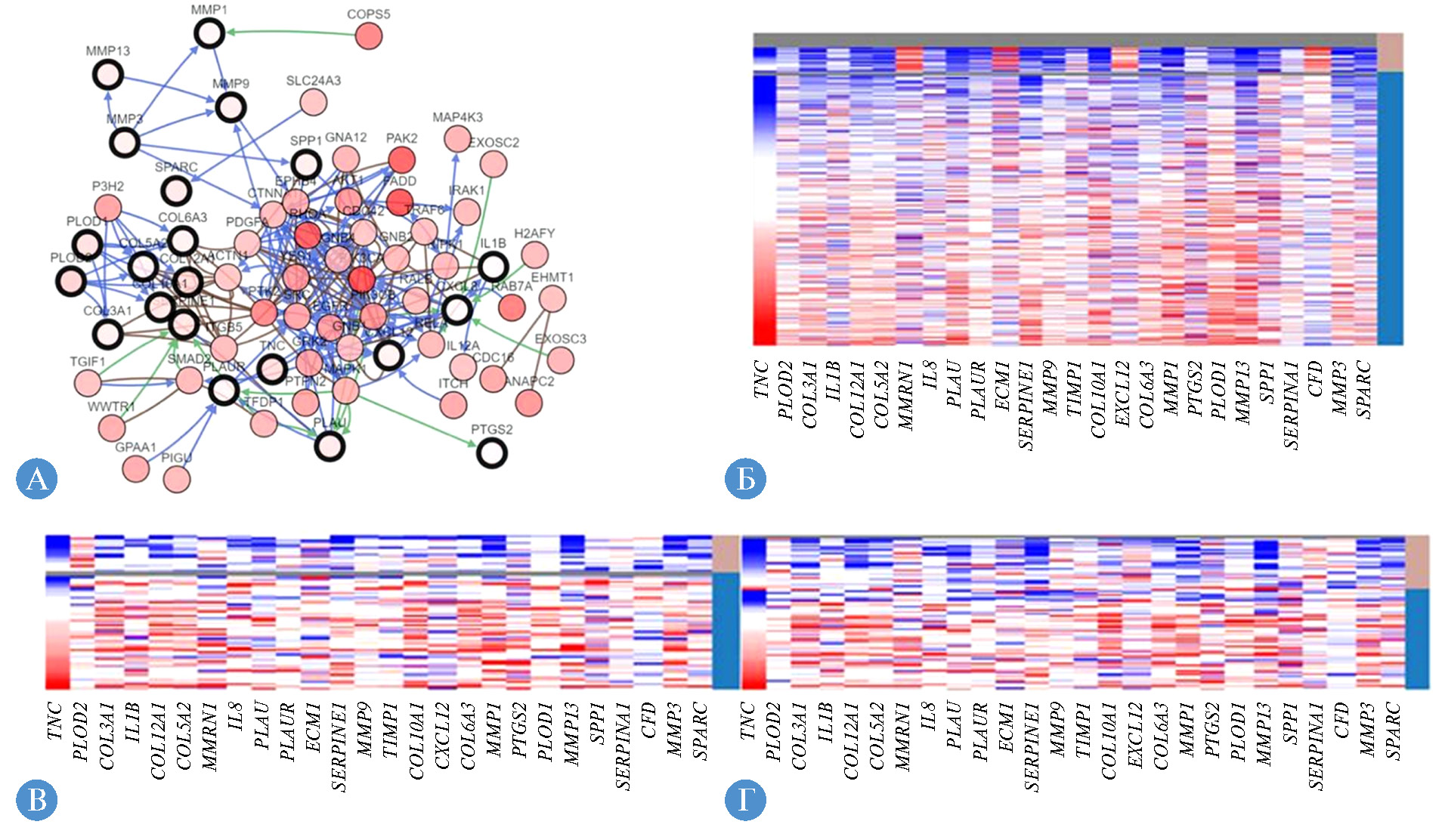 Рис. 3. Анализ генов-концентраторов и их коэкспрессируемых генов, а также иерархическая кластеризация генов-концентраторов: A — гены-концентраторы и их коэкспрессируемые гены, проанализированные с помощью cBioPortal. Узлы с жирными черными контурами представляют собой гены-концентраторы, узлы с тонкими черными контурами — коэкспрессируемые гены. Цвет в круге представляет собой полное изменение гена в геномных профилях, включая повышенную и пониженную экспрессию. Интенсивность цвета указывает на большее изменение. Синяя стрелка обозначает изменение состояния; зеленая — контроль-экспрессии; Б — образцы, сгруппированные коричневой полосой, не являются злокачественными образцами, а образцы, сгруппированные синей полосой, являются образцами рака языка; В, Г — образцы, сгруппированные коричневой полосой, являются HPV-положительными образцами, а образцы, сгруппированные синей полосой, — HPV-отрицательными. Красный цвет указывает на активацию генов, а синий — на подавление активности генов