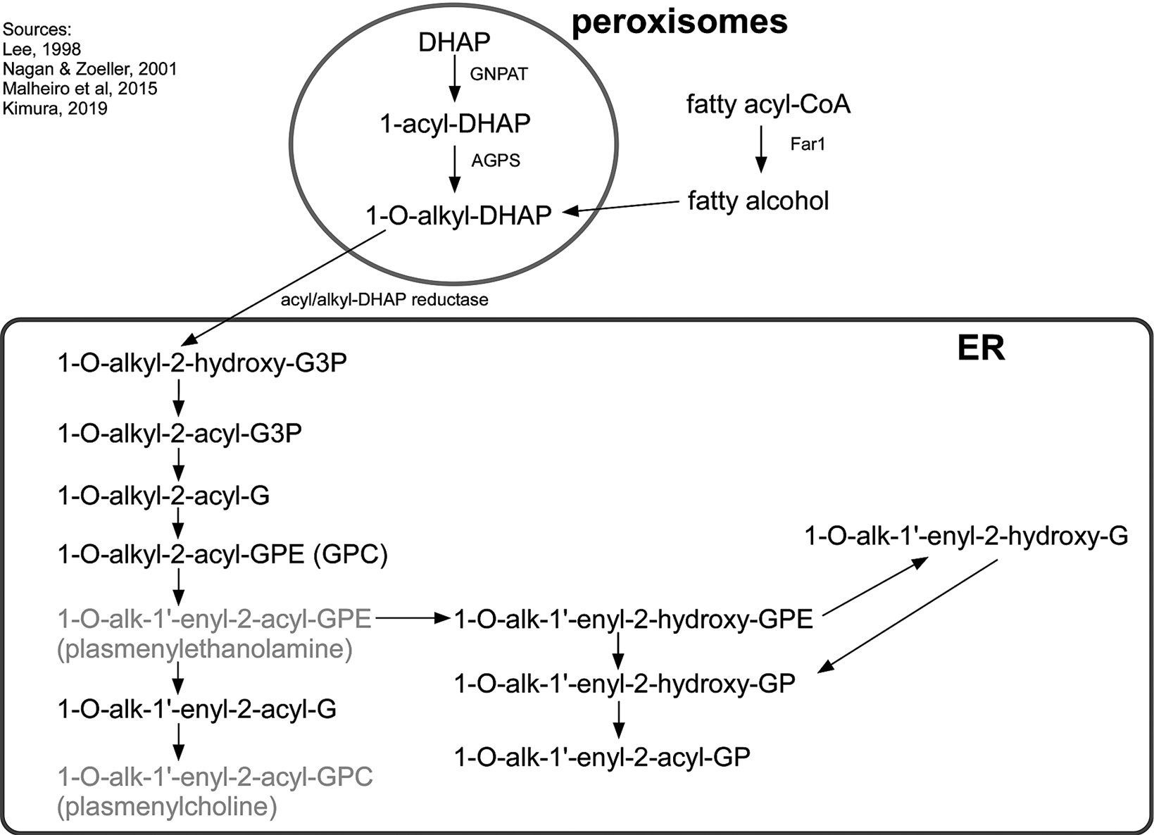 Далее 1-O-алкил-DHAP переносится из пероксисомы в эндоплазматический ретикулум, где алкилацил DHAP редуктаза катализирует его восстановление с образованием 1-O-алкил-2-гидрокси-sn-глицерин-3-фосфата. Затем алкилацил глицерофосфат ацилтрансфераза катализирует ацилирование ацил-КоА в положении sn-2 с образованием 1-O-алкил-2-ацил-G3P [58]. Фосфатная группа -O-алкил-2-ацил-G3P удаляется фосфогидролазой с образованием 1-O-алкил-2-ацилглицерина. Головная группа этаноламина фосфата добавляется к 1-O-алкил-2-ацилглицерину с помощью этаноламинфосфотрансферазы с образованием плазманилэтаноламина, который превращается в PlsEtn под действием 1’-алкилдесатуразы в присутствие молекулярного кислорода и НАДФН. PlsCho образуются после гидролиза PlsEtn в 1-O-(1Z-алкенил)-2-ацил-sn-глицерин [33, 43].